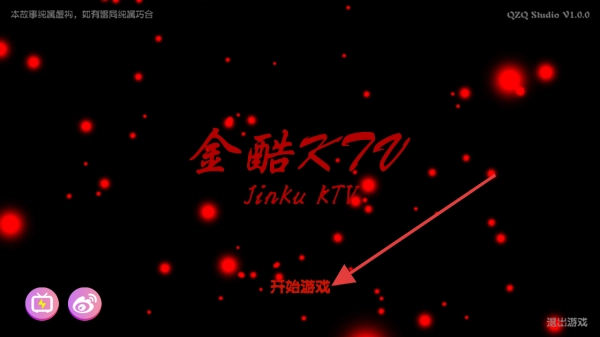 1、启动金酷KTV应用,点击开始游戏选项,进入剧情环节,注意查看“本故事纯属虚构”的提示信息,由此开启KTV主题的解谜冒险之旅。