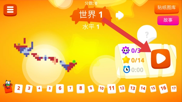 1、画面展示的是世界1的场景,当前玩家处于第一关,界面上显示着1-17的关卡,点击橙色的播放按钮即可进入游戏。