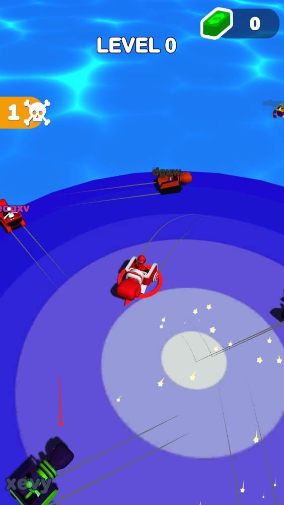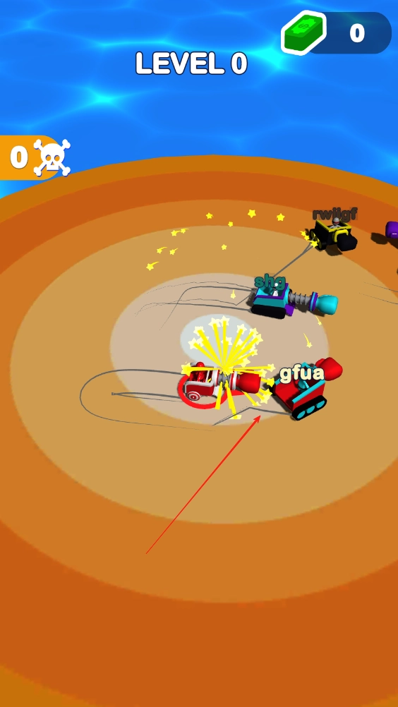 1、赛车在海上的一个小平台中央与其他赛车展开撞击对决,滑动屏幕能操控赛车朝其他赛车的方向移动,点击屏幕即可释放拳头攻击。