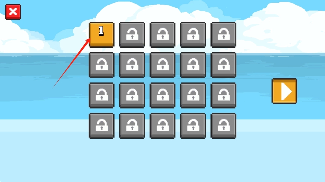 2、关卡选择,点击数字1关卡,进入第一关,准备挑战冒险,点击按钮选择当前游戏关卡。