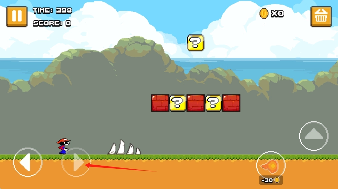 3、关卡界面,操控角色移动,跳跃撞击问号方块,躲避尖刺,推进关卡进程,点击移动人物。