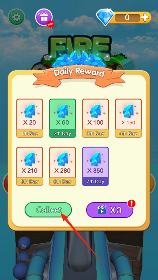 进入每日奖励页面后,可查看7天对应的不同钻石奖励数量,点击Collect按钮即可直接领取奖励;若想获得更多钻石,可点击紫色按钮,通过观看广告来三倍获取奖励,以便积攒钻石购买道具。