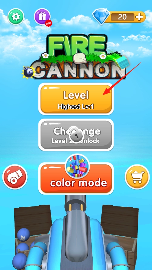 2、回到主界面,点Level按钮,进入关卡选择,当前最高到1级,选这个关卡,操控火炮,对准目标,发射炮弹,开始摧毁建筑的挑战,看能不能顺利通关。