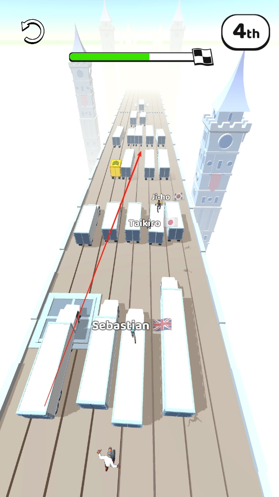 2、一个车厢上无法停留过久,我们需要不停地在车厢上跳跃更换车厢,遇到黄色车的时候踩上去再跳跃会跳得更高更远。