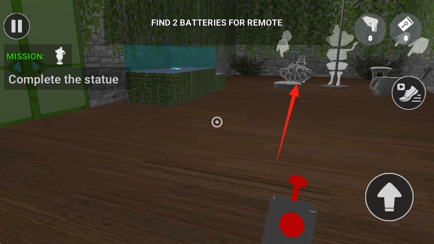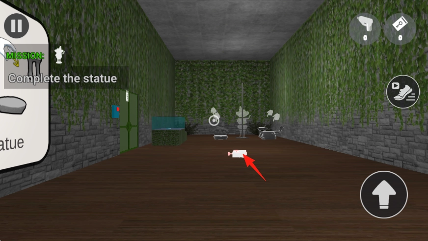 1、在摆放绿植的房间里,拾取地面上的物品,然后根据“Complete the statue”任务的要求,去寻找雕像的各个部件。