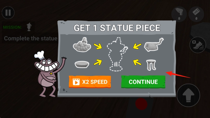 3、收集雕像部件如腿部,完成GET1STATUEPIECE,点击CONTINUE,解锁新任务,组装完整雕像。