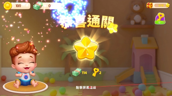 3、通关后获取星星、钞票、钥匙奖励,点击屏幕继续。