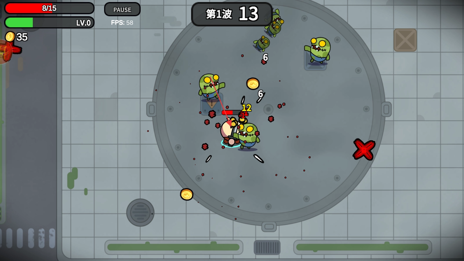 3、滑动屏幕移动控制角色,绕圈走位清僵尸,收集金币提升攻击。