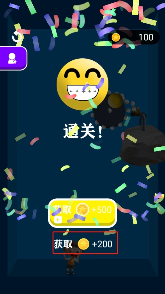 3、通关后点击获取+200按钮领取金币奖励,积累资源可用于后续关卡挑战或解锁新道具,延续游戏进度。