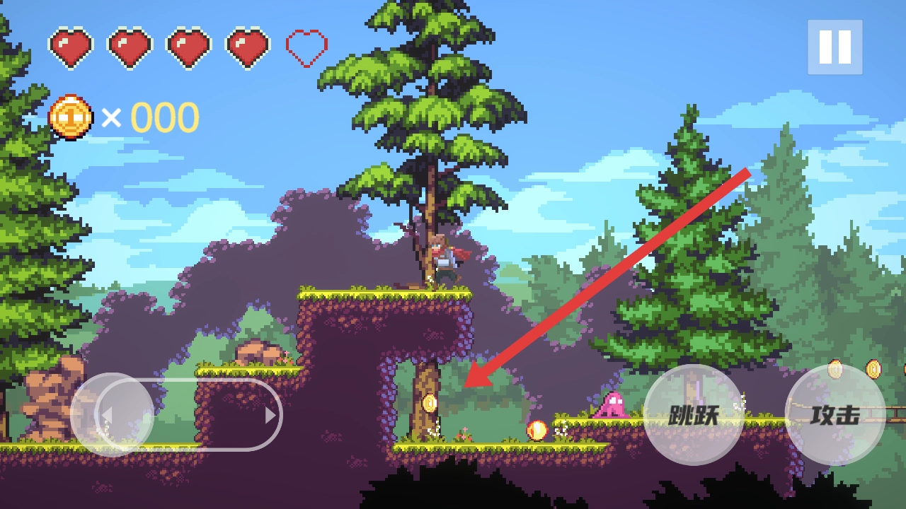 2、利用跳跃的按键跨越地形落差,需要注意下方怪物与金币,规划角色移动路径拾取金币,消灭敌人。