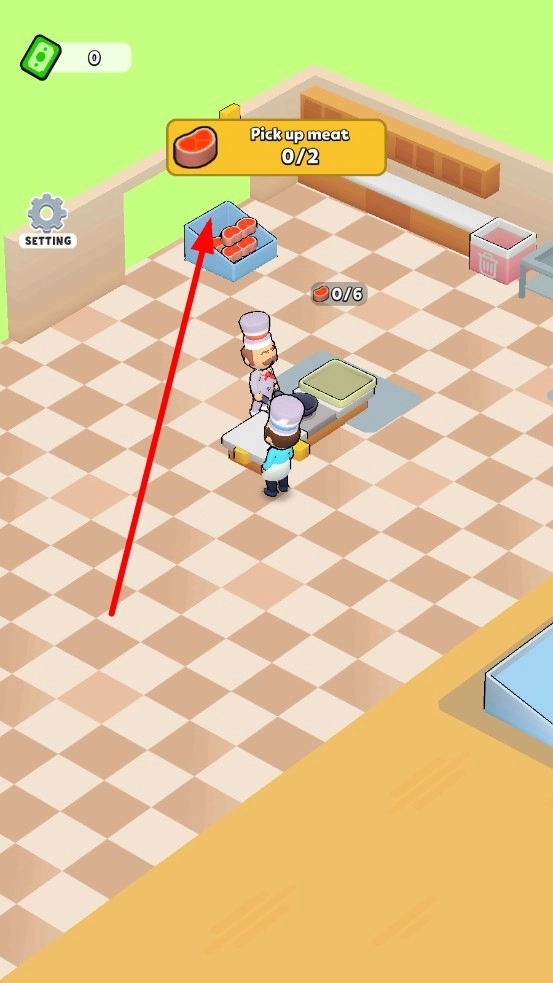 1、进入餐厅后,当界面显示“Pick up meat 0/2”的提示时,操控角色前往食材区取肉,完成基础采购,为后续的烹饪环节储备所需原料。