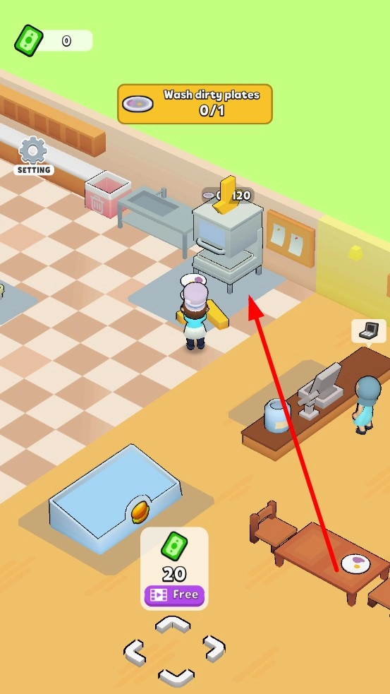 3、顾客用餐后,界面提示Wash dirty plates 0/1时,将脏盘子送至清洗区处理,并且收银,维持餐厅整洁,逐步解锁新餐桌与用餐区。