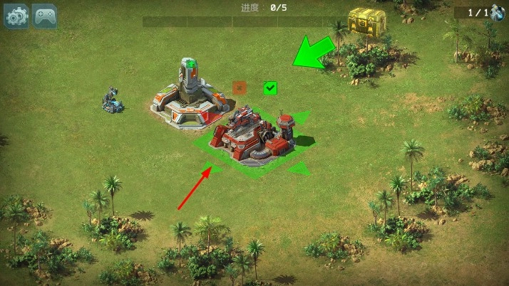 1、进入界面后,按照箭头所指的方向,点击选定想要建造的建筑,将其放置到指定的区域内,以此启动基地的搭建工作,推动建造进度向前发展。