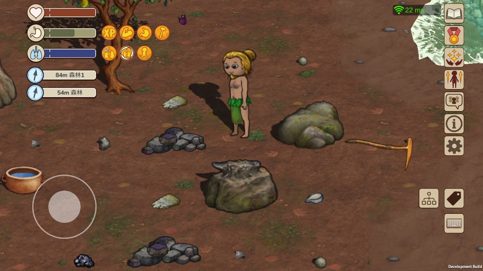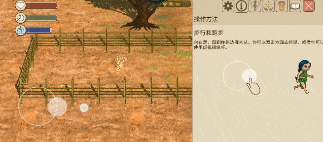 村民进入部落后,双击地图中的任意位置人物就会自动移动前往,或是通过左下方方向盘滑动来操控人物的前后左右移动。村民们可以对物品进行点击交互,人物手上一共可以拿取两个物品,点击地面可以将手中的物品放下,从而进行更多操作。