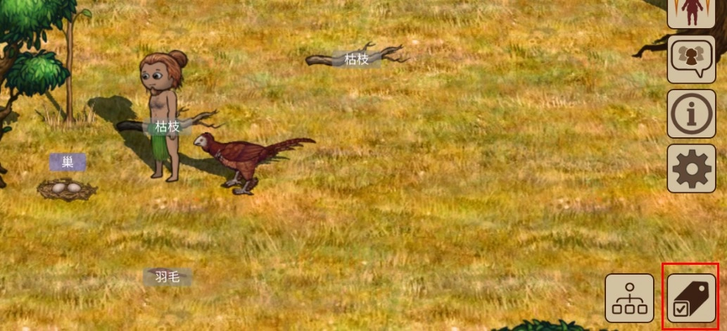 村民们打开右下角标签功能,部落内的动植物的名称就会显示。名称的背景有灰色和紫色两种。灰色背景道具为一般的道具,可以直接点击捡起手持;紫色背景的道具点击后限时会产生新的物品,再次点击上面的带有吃的小框,即可拿到手上食用。例如有果实的果树、有蛋的鸟巢都是紫色背景可交互,交互完成后可以得到能食用的果实和鸟蛋。