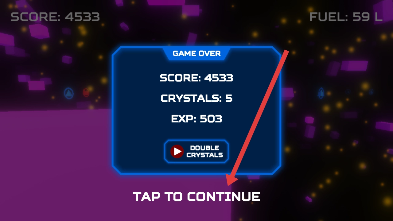 3、碰到其他的障碍物会,弹出游戏结束的界面,需点击TAP TO CONTINUE,查看结算信息。