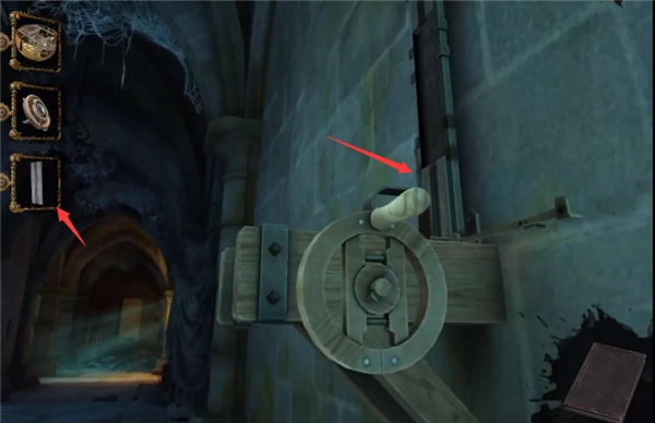 8、向上拖动机关,左侧绳子落下,点击左侧绳子。