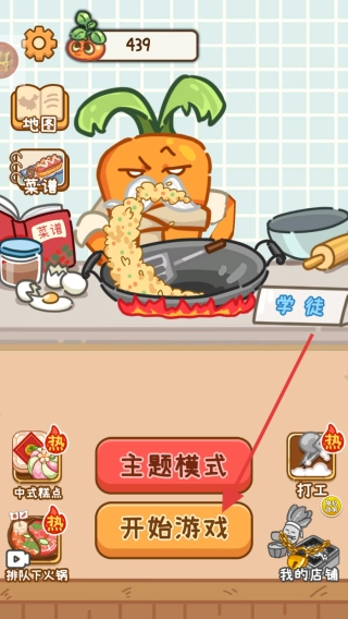 2、在游戏主界面,点击开始游戏按钮,进入游戏场景,开始进行烹饪等游戏操作,完成游戏任务。