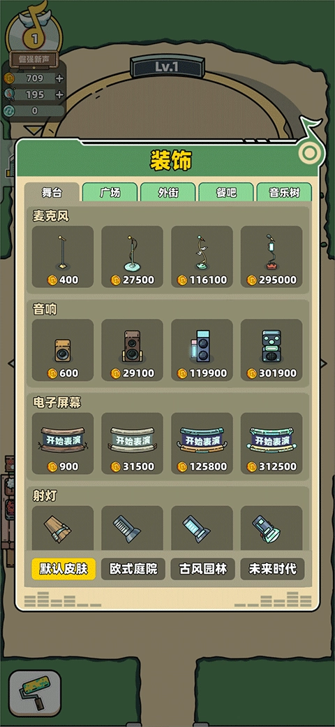 5、使用金币可以为广场、舞台、外街、餐吧、音乐树购买各种装饰品来让他变得更绚丽