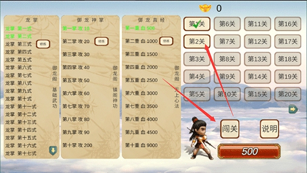 进入游戏后,我们能看到绝世武功支持修炼操作,点击闯关并选定关卡,就能挑战武林高手了。