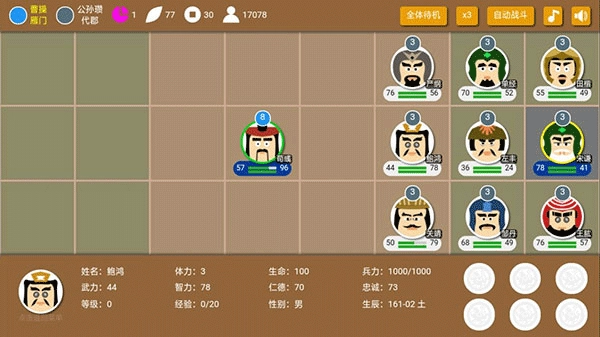 右边武将名字上面的数字分别表示武力和智力,例如曹操武力82智力89