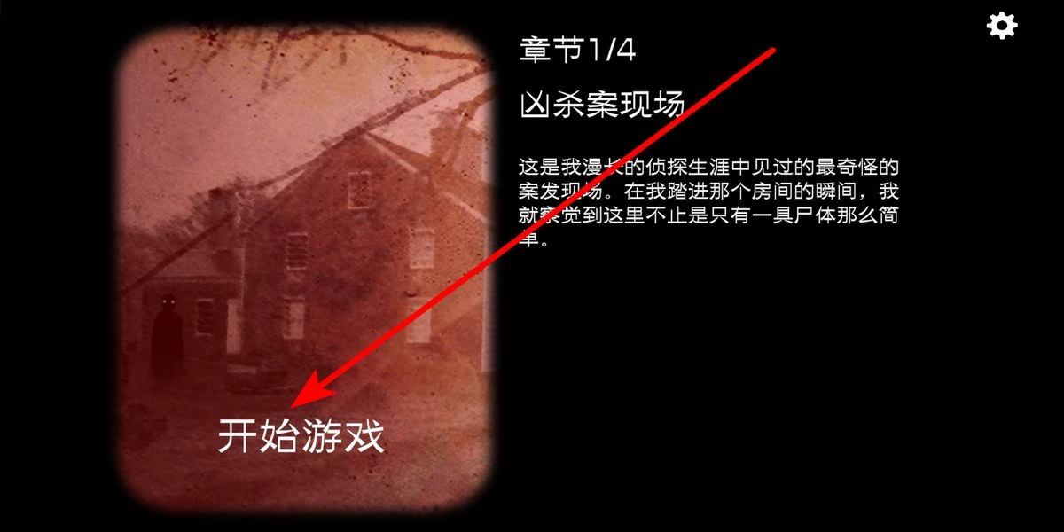 1、点击“开始游戏”选项,在游戏界面中找到对应的开始游戏按钮并点击,此时界面会呈现章节相关的介绍信息,比如章节四分之一凶杀案现场等内容,之后便会进入游戏场景,开启冒险之旅。