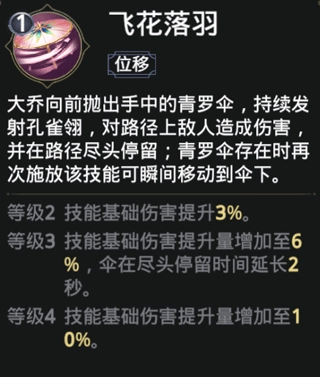 【飞花落羽】这个技能是大乔向前抛出伞,持续发射孔雀翎,对路径上敌人造成伤害。