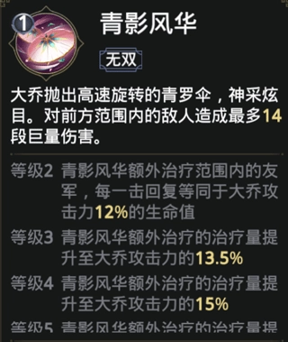 无双技能【青影风华】,能够造成巨量的范围伤害,可以说是绝招。当技能等级提升后,这个技能还能给自己和友军回复生命。这就使得大乔在60v60的势力战、3v3公平竞技又或者是野外混战抢BOSS时,优势极为明显,无论是作为输出主力,还是利用无双技能给予队友治疗,那作用都是杠杠的!