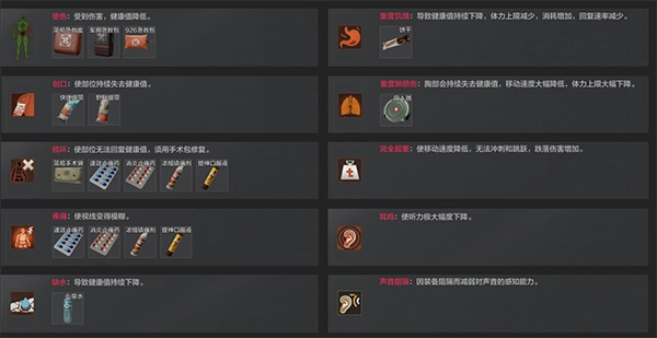 当某个部位受伤时,健康值会相应地下降,此时该部位呈现红色。如果该部位的健康值继续下降至0时即进入损坏状态,显示为黑色。此时无法通过治疗恢复该部位健康值,视线会因为疼痛变得模糊,身体机能也会受到影响:“头部”和“胸部”一旦损坏便撤离失败,所以残血要尽快治疗。
