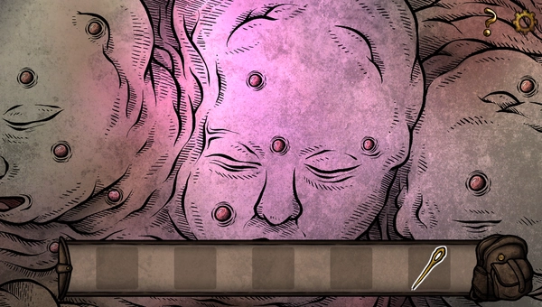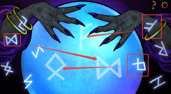 2、醒来后出现在柜子里,一直往右走,出现紫衣女人,对话后将对应符号挪到魔法球上,进入以下情景,红框处拿起金针