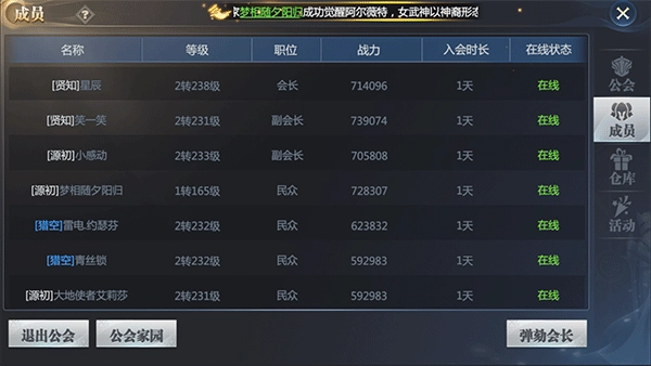 公会职位:公会职位分会长、副会长、精英及普通成员。其中会长、副会长和精英有清理公会仓库的权限。