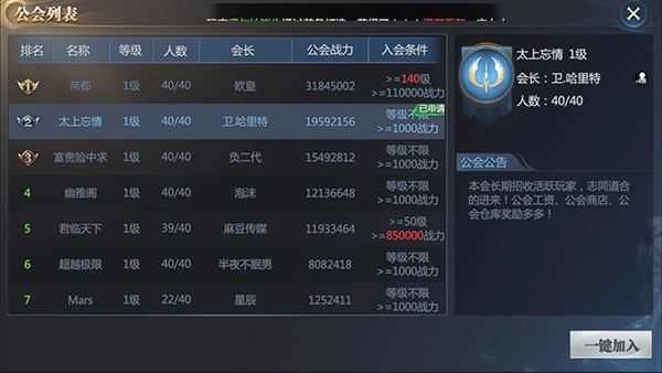 在列表界面,我们能够查看同区域其他帮会的相关情况,知晓对方的状态!毕竟知己知彼才能百战不殆。