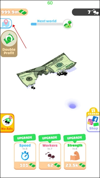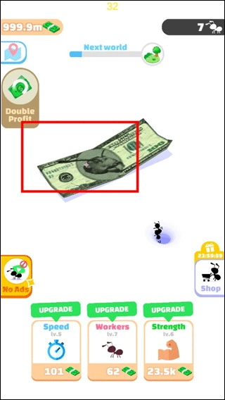 1、首先大家进入小蚁帝国游戏,能看到蚂蚁要搬运的物品,这些物品可能是食物,这次小编遇到的是钞票。