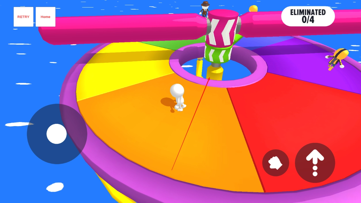 进入游戏后,选择第一个模式,上方的杆子会持续旋转,脚下的方块可能会坍塌,要注意别掉下去。