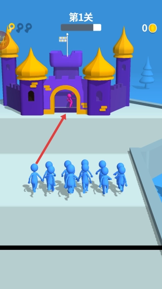 3、攻城胜利:带领蓝色人群抵达紫色城堡,攻破防线,进入城堡,完成关卡。