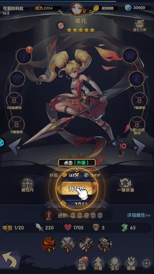 3、还可以对自己的英雄角色升级,从而提升属性,提升战斗力;