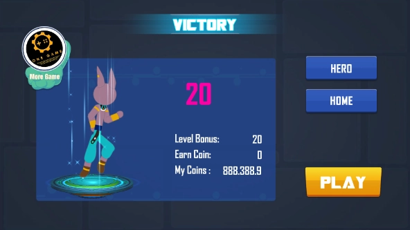 1、进入游戏后,可通过右上角的设置功能,对游戏内的音效和背景音乐进行开启或关闭操作;在“hero”选项中还能切换不同的人物,具体可参考下图展示。