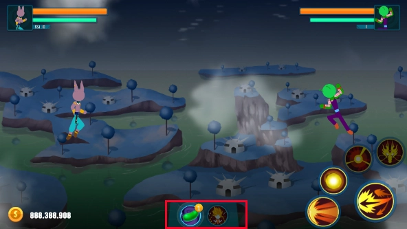 4、对战中除了基本的技能与攻击外,我们还可使用特殊道具激活超级赛亚人状态,可大幅提升角色属性,更加的容易获得胜利