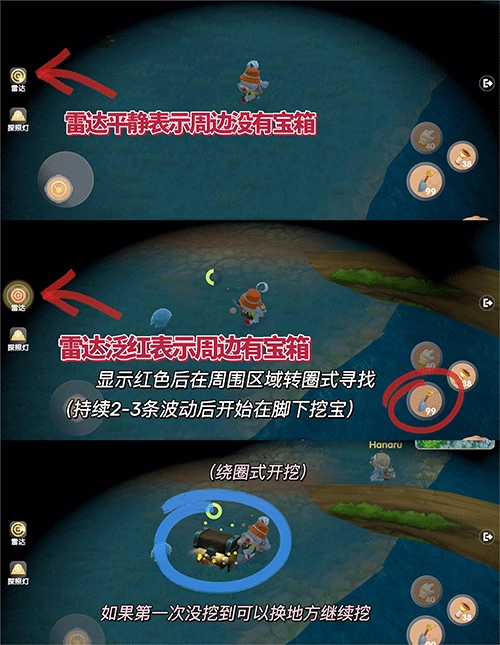 4、雷达频繁发出红色波动!表示宝箱就在附近!可以在脚下用铲子进行挖宝~