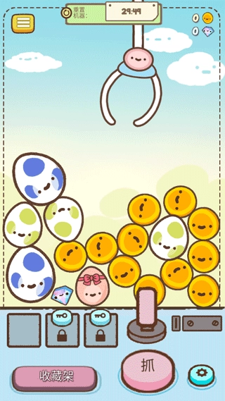 打开游戏后,会出现一个简单的抓彩蛋环节,帮助你快速熟悉操作流程。首先按住上方的杆子,移动最顶端的爪子,待爪子移动到合适位置时,点击下方标有“抓”字的按钮即可。