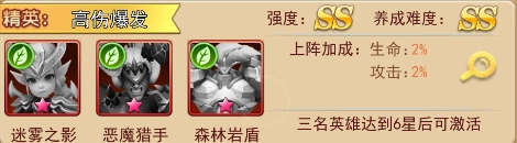 组合说明:绿森阵营非常强力的搭配!是进攻性超强的组合!恶魔猎手和迷雾之影皆可重点培养,前者输出稳定,后者爆发性更强。