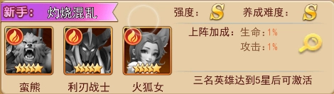 组合说明:利刃战士与蛮熊叠加灼烧输出伤害,火狐女辅助提高灼烧威力,攻击与控制兼备。