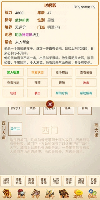 6、找到引导中的封躬影这个角色之后,点击他,就会出现加入明教和拜师的选项了。