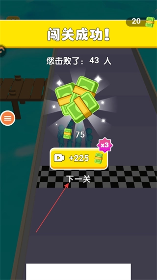 4、成功击败43人后,显示闯关成功,获得奖励,点击“下一关”进入新关卡。