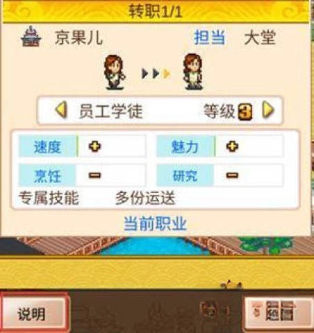 特殊员工的招募往往带来更高的能力值,但也伴随高昂的费用。游戏中的员工职业多达十八种,转职条件可以通过“说明”按钮进行了解,合理安排员工将助你事半功倍。