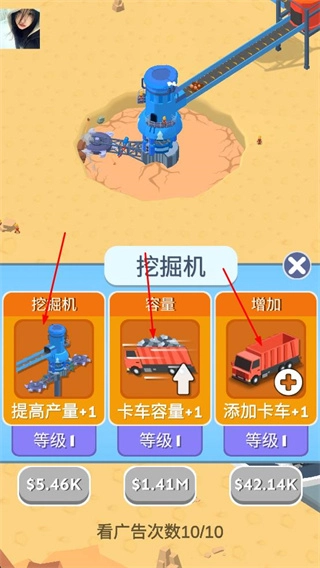 4、在升级界面,消耗金币升级挖掘机、卡车容量等设施,提升生产和运输能力。
