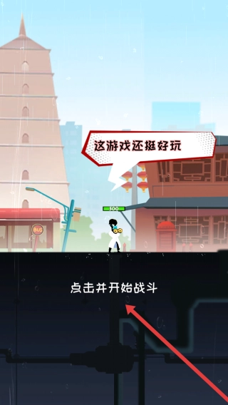 1、在主界面找到箭头指向的“点击并开始战斗”按钮并点击,即可进入游戏战斗场景,之后你可以操控角色在城市环境里开启闯关挑战。
