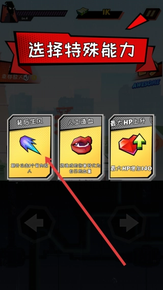 3、技能选择页,点击“背后生风”(箭头指向),获取“获得攻击速度加成”效果,增强角色战斗能力,继续闯关。