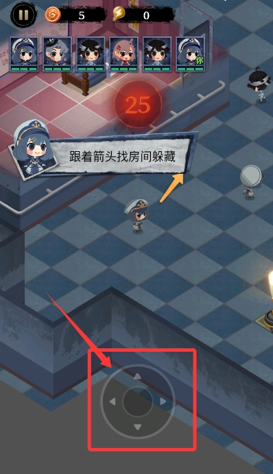 2、利用左下角虚拟摇杆灵活移动角色,跟随指引箭头快速寻找安全藏身之处。