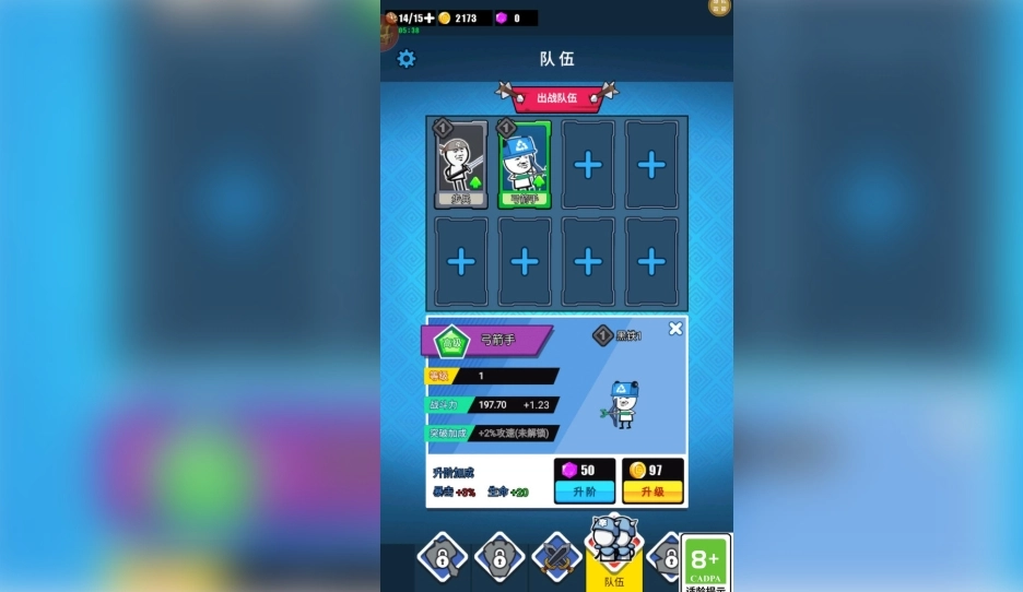 2.例如,升级弓箭手可获得“暴击+3%、生命+20”的属性加成。